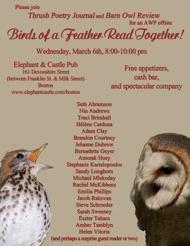 Thanks to the generosity of the folks at Barn Owl Review & Thrush, I've been invited to participate in a group reading on Wednesday, 6 March 2013 at the start of this year's AWP in Boston. Is this not the prettiest poster?